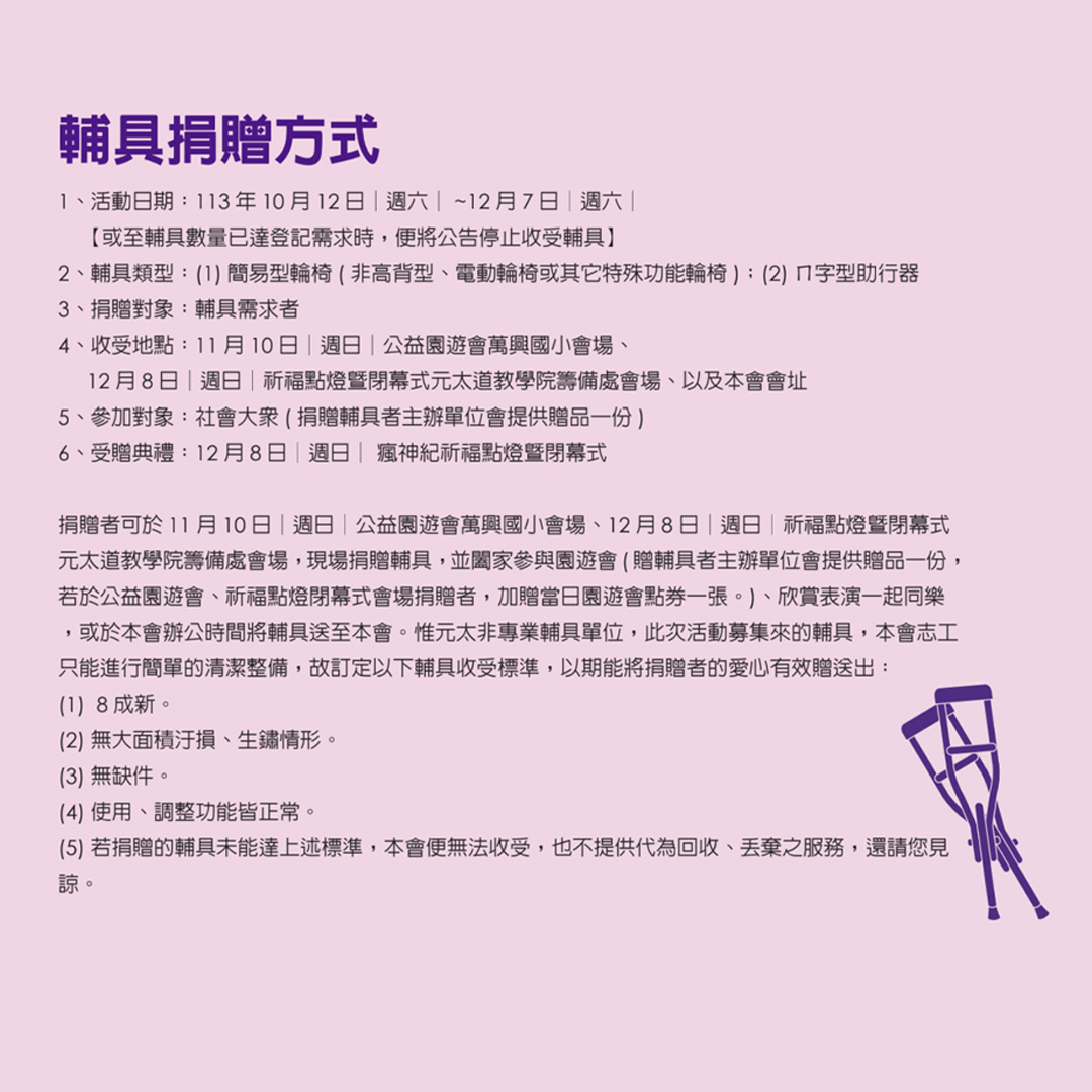 1、活動日期:113 年 10 月 12 日 ( 週六 )~12 月 7 日 ( 週六 ) 【或至輔具數量已達登記需求時,便將公告停止收受輔具】